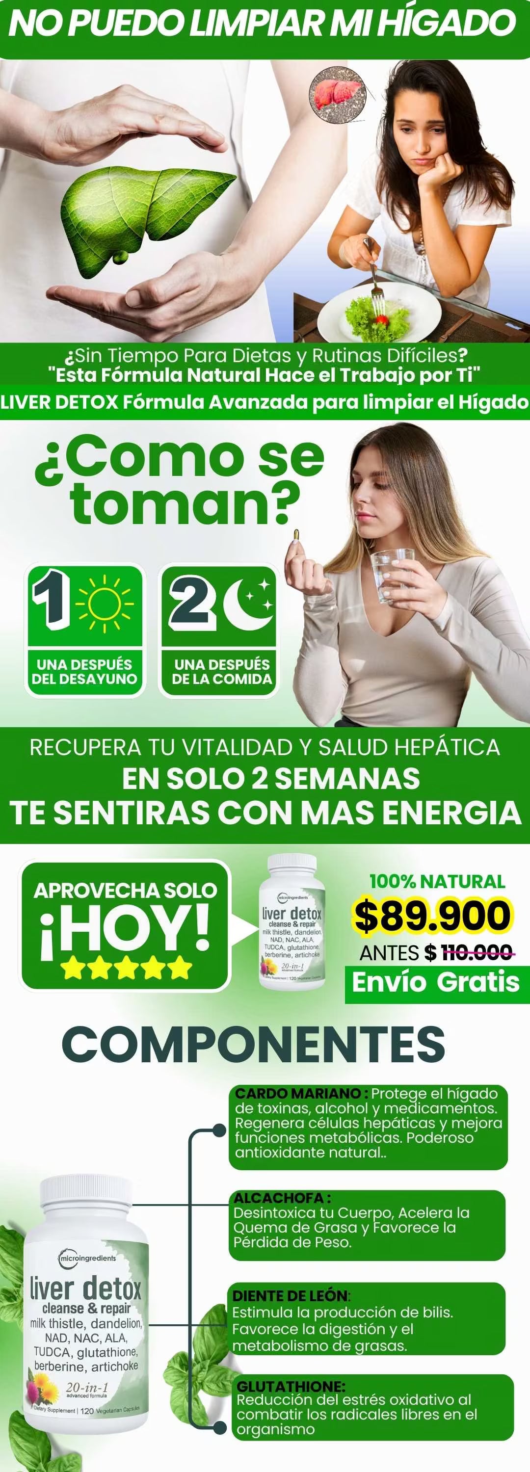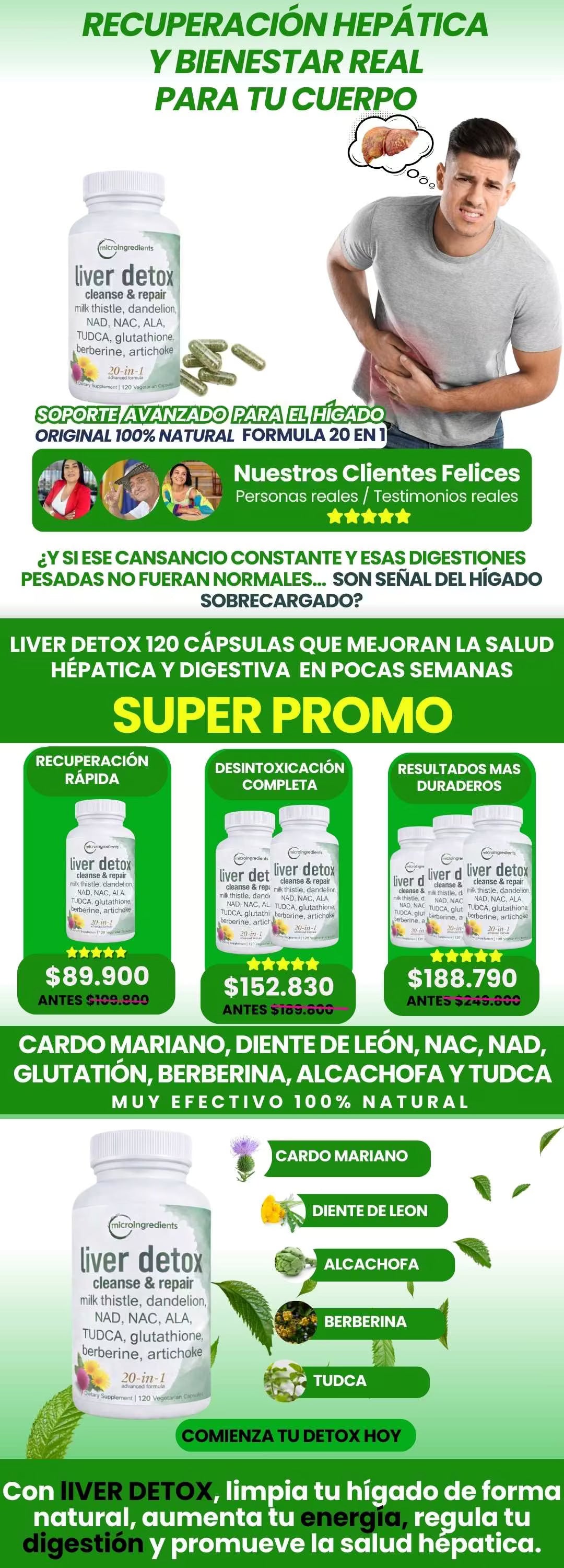 Contiene una fórmula avanzada 20-en-1 con ingredientes como cardo mariano, diente de león, alcachofa, NAC, NAD, glutatión, berberina y TUDCA, reconocidos por su uso en bienestar hepático.