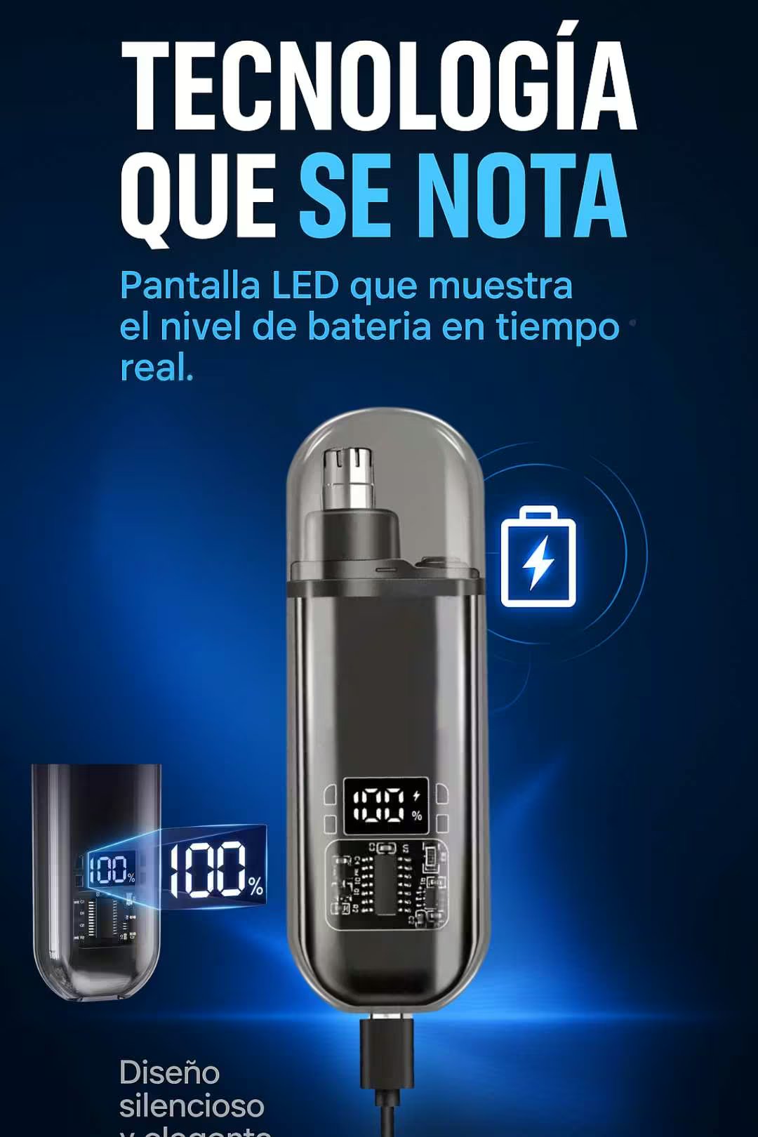 Carga por USB (laptop, cargadores o power bank). La pantalla LED muestra el nivel de batería. La autonomía varía según uso, pero suele cubrir varias sesiones de aseo antes de la siguiente carga.