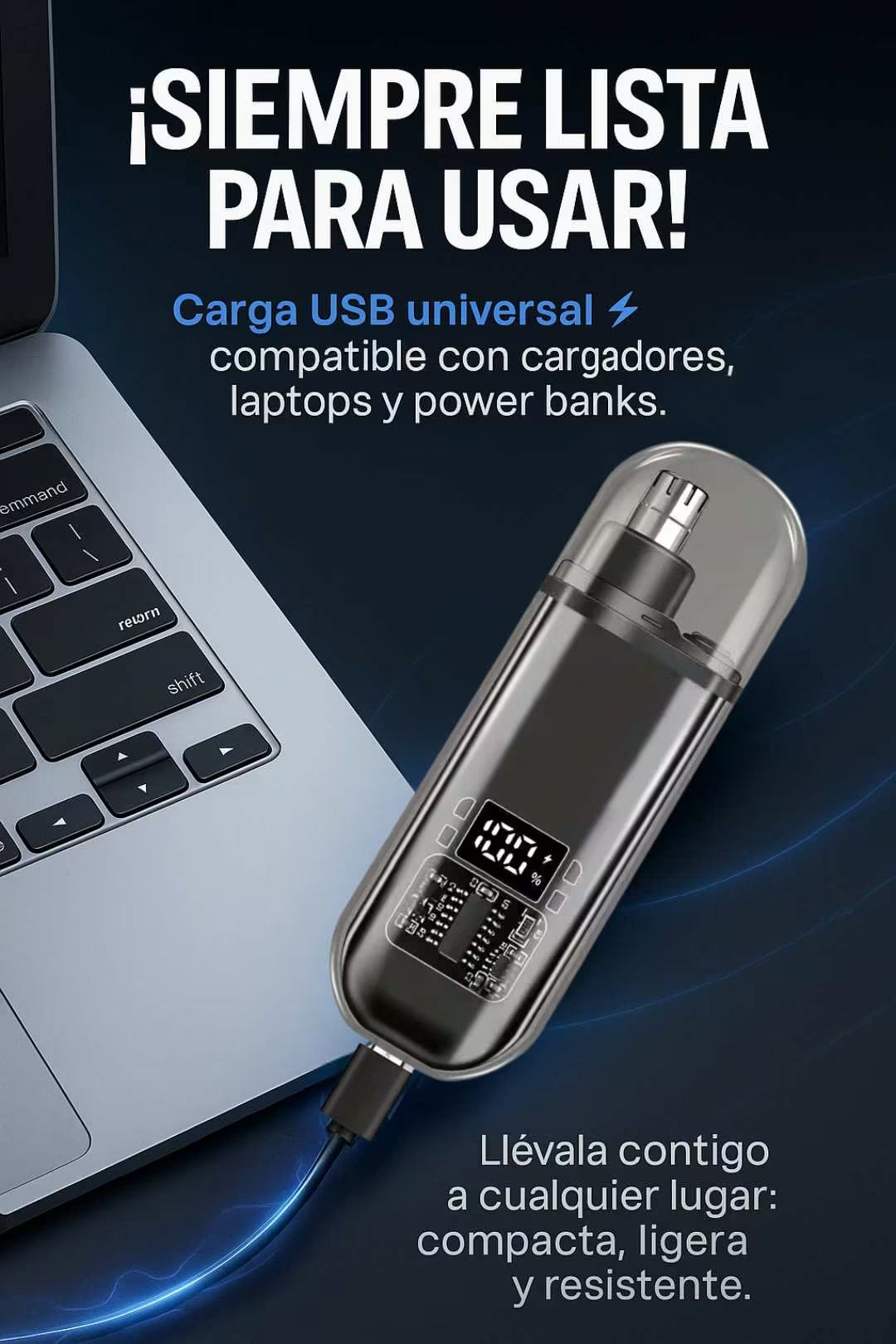 Es compacta y ligera, con diseño tipo bolígrafo. Cabe en el maletín o estuche de viaje. Ideal para oficina, casa o viajes por su carga USB universal.