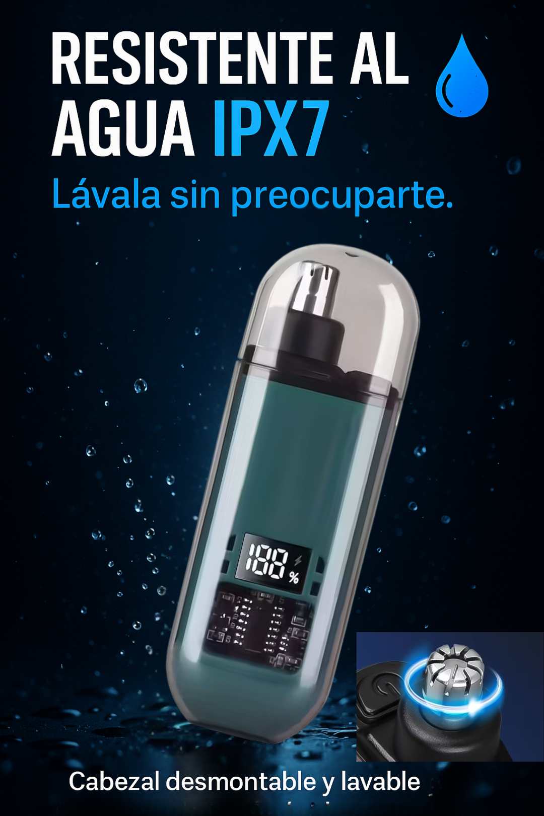 Sí. Es resistente al agua (IPX7). Puedes enjuagar el cabezal desmontable bajo el grifo. Sécalo bien antes de guardarlo. Evita sumergir por tiempos prolongados fuera de las indicaciones del fabricante.